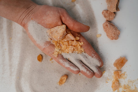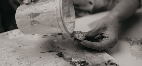 Marx not only observes the landscapes she paints, she physically incorporates them. She collects sand and stones from each location, grinds them into pigments, and embeds these minerals directly into the layers of the artwork. The textures of the earth – grains, dust and fragments of stone – become inseparable from the painting itself. The landscape does not merely inspire the work; it lives within it, making every piece a tangible fragment of place.
