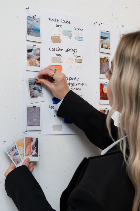 Marx’s process is rooted in contrasts in nature. She travels to landscapes that appear serene and awe-inspiring on the surface yet hold quiet tension beneath; places where beauty and fragility collide with danger and movement. Each painting begins with a Polaroid photograph taken on location, capturing an unfiltered moment of the landscape. These images become emotional and conceptual anchors that shape the artwork. Her work reflects the contrasts found in nature while mirroring those within the human experience.